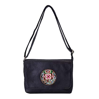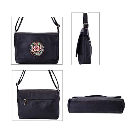 100% Genuine Leather Adjustable Crossbody Bag with Embroidered Flower Pattern - Black