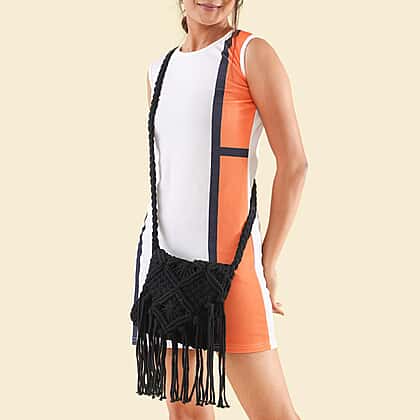 100% Cotton Crossbody Macrame Bag with Long Handle and Fringes - Black