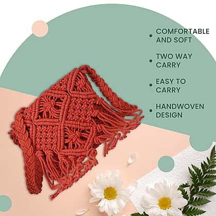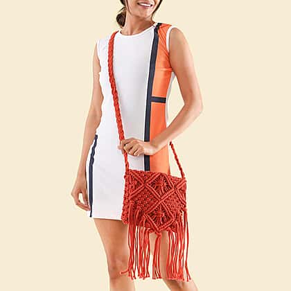 100% Cotton Crossbody Macrame Bag with Long Handle & Fringes - Rust Orange