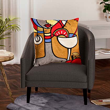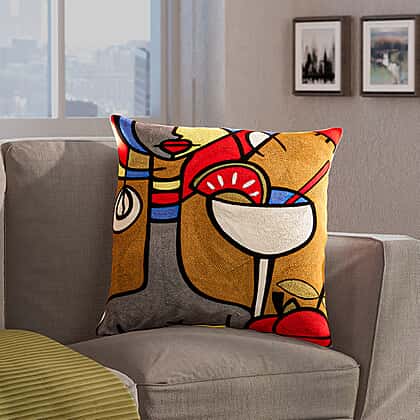 100% Cotton Embroidered Cocktail Glass Pattern Cushion Cover (Size 43 cm) - Brown & Multi
