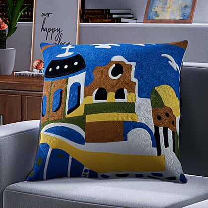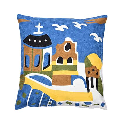 100% Cotton Fully Embroidered Cushion Cover with Zipper Closure (Size 45 cm) - Blue, Yellow & White