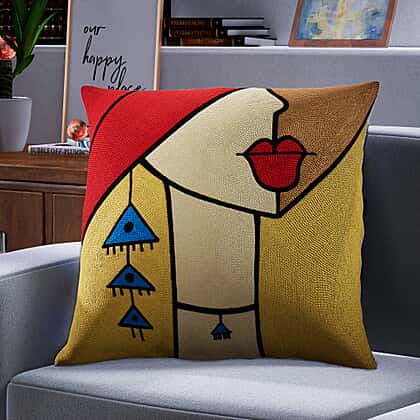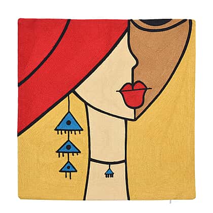 100% Cotton Fully Embroidered Lady Cushion Cover with Zipper Closure (Size 45 cm) - Mustard & Red