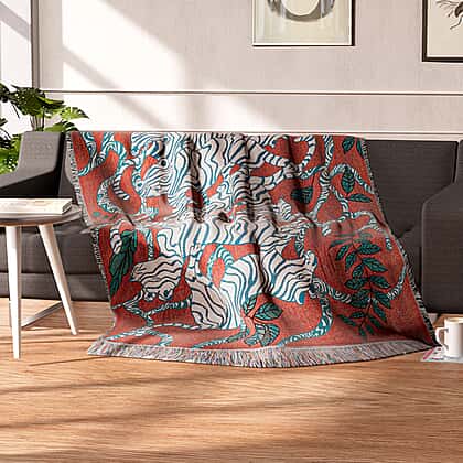 100% Cotton Jacquard Woven Animals Print Throw with Fringes (Size - 150X125 Cm) - Red & Blue