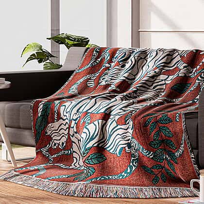 100% Cotton Jacquard Woven Animals Print Throw Blanket with Fringes - Red and Blue