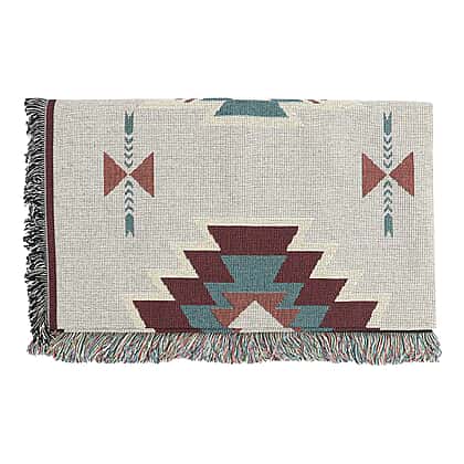 100% Cotton JACQUARD WOVEN Floral Print Throw with Fringes (Size - 150X125 Cm) - Beige & Multi