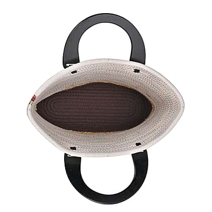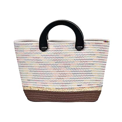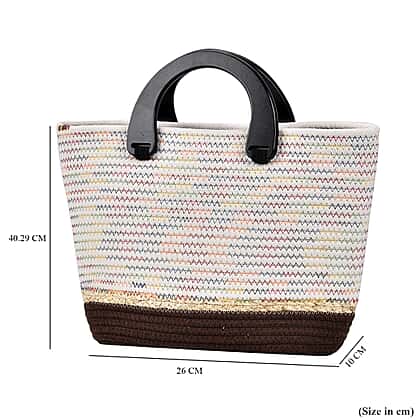 100% Cotton Knitted Handbag with Wooden Handle - Brown & Multi