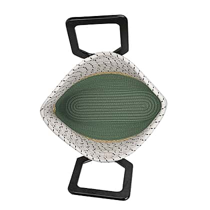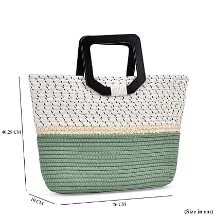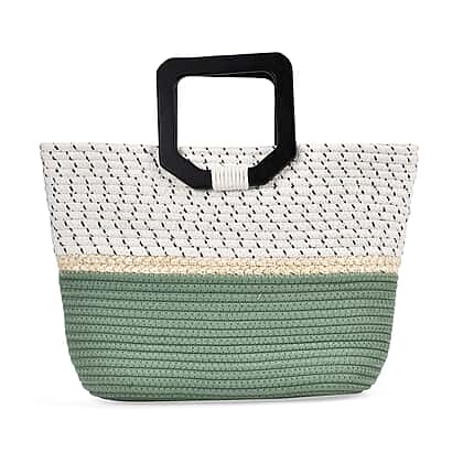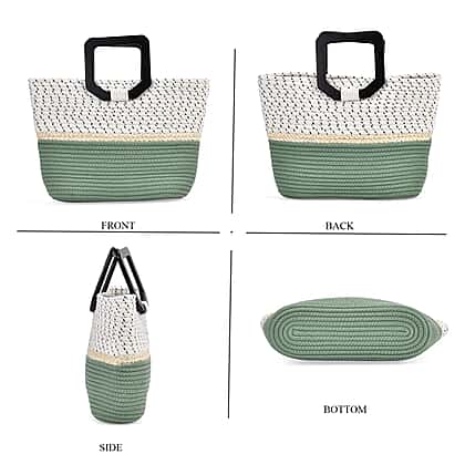 100% Cotton Knitted Handbag with Wooden Handle - White & Green