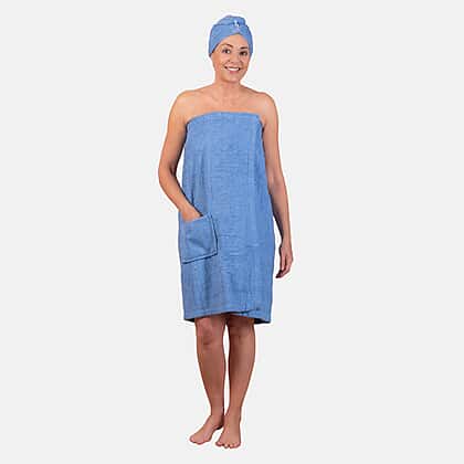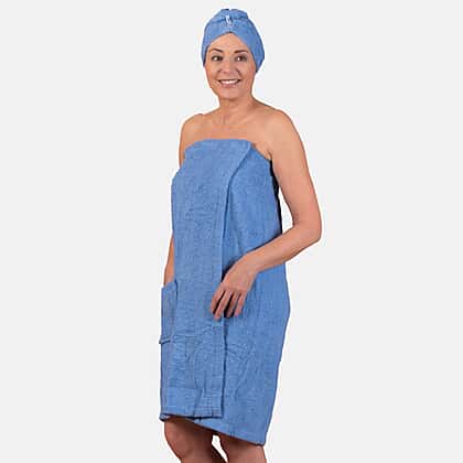 100% Cotton Womens Shower Body Wrap with Hair Cap - Blue