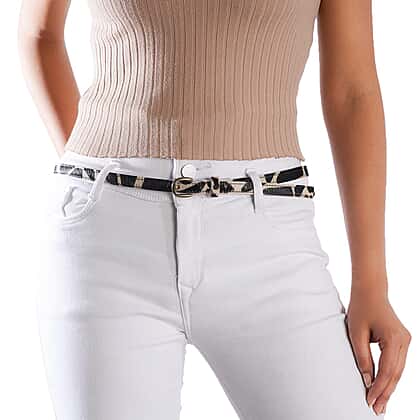 This leopard print leather belt makes a charming addition to your fashion wardrobe. This belt is made of genuine leather and has an iconic leopard print, providing a chic style. This slim-looking belt will fasten your jeans or be a fashionable grip with a kaftan or dress. This belt has a metallic buckle, providing easy locking and giving you different size parameters with the holes. You can adjust the size by digging more cavities with the required tools. You can get this for yourself or gift it to a woman to help her elevate her style.