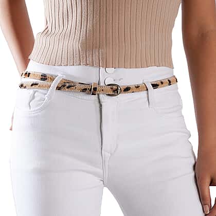 This leopard print leather belt makes a charming addition to your fashion wardrobe. This belt is made of genuine leather and has an iconic leopard print, providing a chic style. This slim-looking belt will fasten your jeans or be a fashionable grip with a kaftan or dress. This belt has a metallic buckle, providing easy locking and giving you different size parameters with the holes. You can adjust the size by digging more cavities with the required tools. You can get this for yourself or gift it to a woman to help her elevate her style.