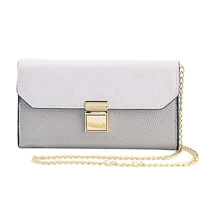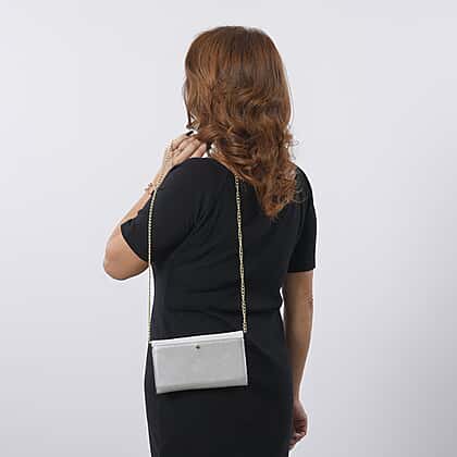 100% Genuine Leather Clutch Wallet with Chain Shoulder Strap & RFID Protection (Size 20x10 Cm) - Silver