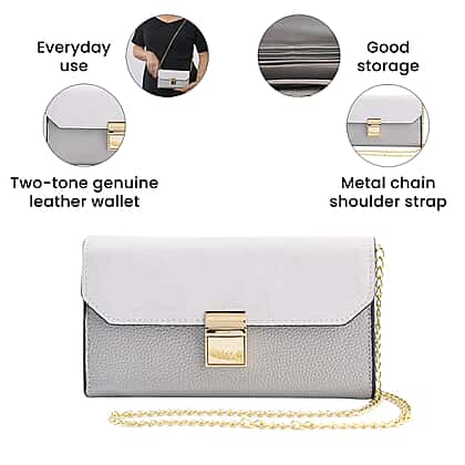 100% Genuine Leather RFID Protected Wallet with Chain Shoulder Strap - Silver