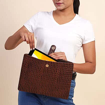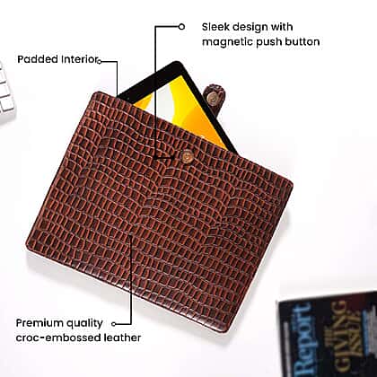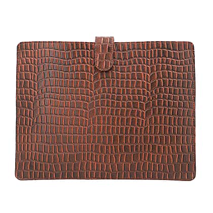100% Genuine Leather Croc Embossed Pattern Tablet Sleeve with Magnetic Push Button (Size 31x24 Cm) - Dark Brown