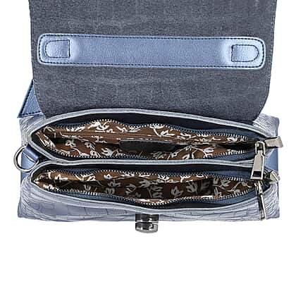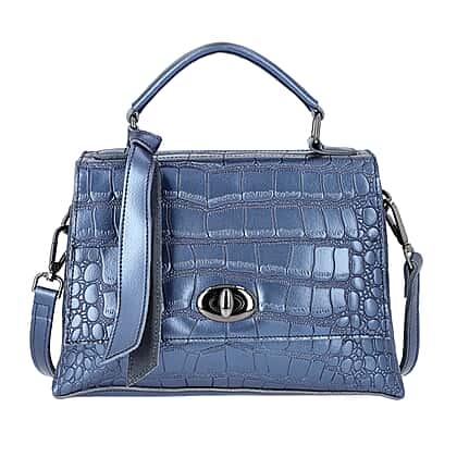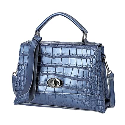 100% Genuine Leather Croc Embossed Satchel Bag with Detachable Shoulder Strap in Navy Size Details 26.5x10.5x18.5 Cm