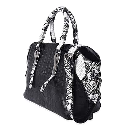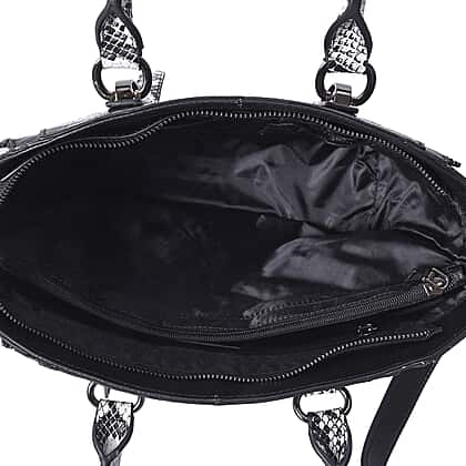 100% Genuine Leather Croc Embossed Tote Bag with Snake Skin Pattern Removable Shoulder Strap (Size 27x11x22 Cm) - Black