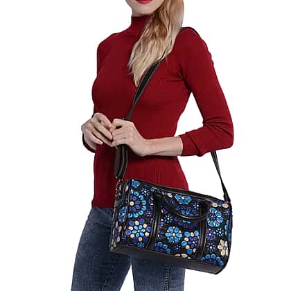 100% Genuine Leather Embossed Floral Pattern Satchel Bag (Size 31x9x21cm) - Brown and Black
