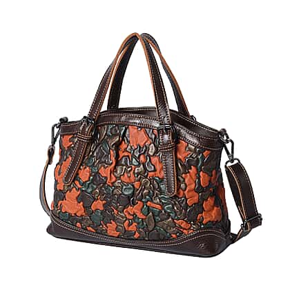 Genuine Leather Embossed Floral Pattern Satchel Bag - Brown and Black