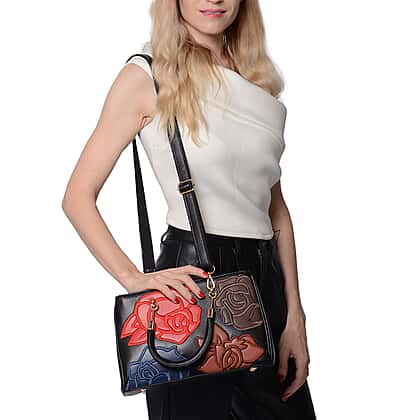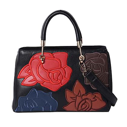 100% Genuine Leather Flower Patterned Handbag with Adjustable Shoulder Starp (30x12x19cm) - Black and Multi Colour
