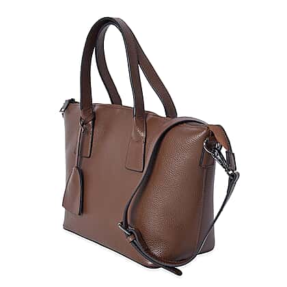 100% Genuine Leather Litchi Pattern Tote Bag with Detachable Shoulder Strap and Zipper Closure (Size 27x14x23 Cm) - Dark Brown