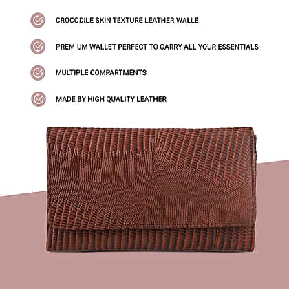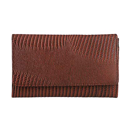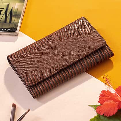 100% Genuine Leather Lizard Embossed Womens RFID Protected Wallet - Brown