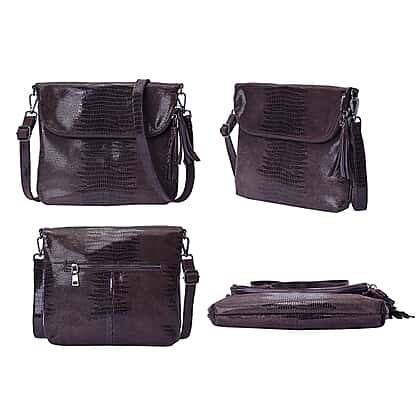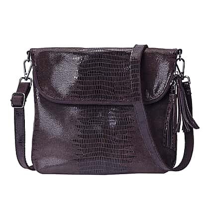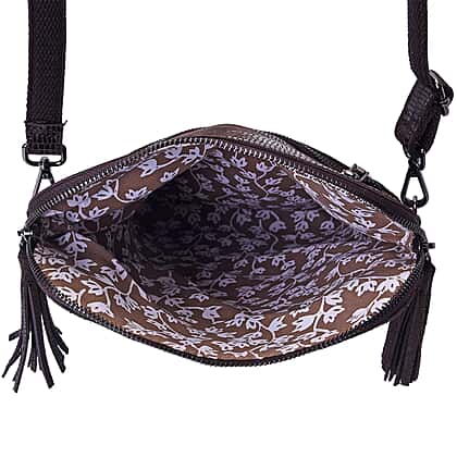100% Genuine Leather Lizard Skin Pattern Crossbody Bag with Adjustable Strap - Coffee Colour