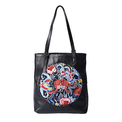 100% Genuine Leather Multi Colour Embroidery Pattern Shoulder Bag - Black