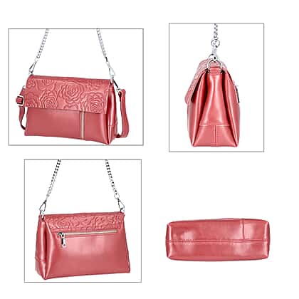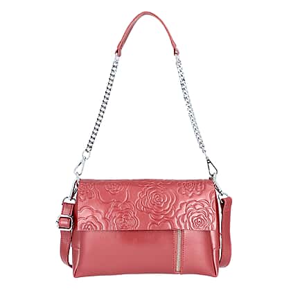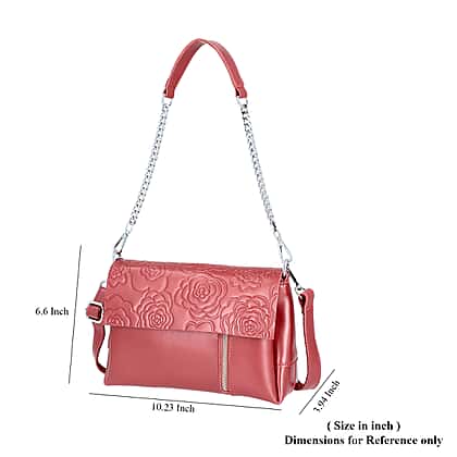 100% Genuine Leather Multiple Pocket Rose Pattern Flap Bag with Detachable Shoulder Strap in Red Size Details 25x9x18 Cm