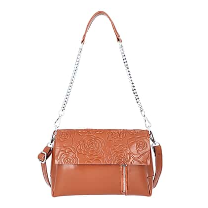 100% Genuine Leather Multiple Pocket Rose Pattern Flap Bag with Detachable Shoulder Strap (Size 25x9x18 Cm) - Tan