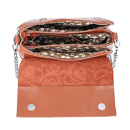 100% Genuine Leather Multiple Pocket Rose Pattern Flap Bag with Detachable Shoulder Strap in Tan Size Details 25x9x18 Cm