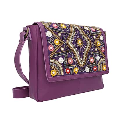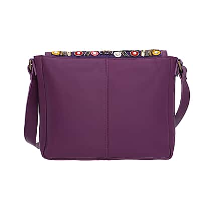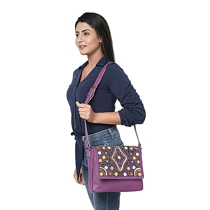 100% Genuine Leather Purple Crossbody Bag with Multi Colour Embellishments
