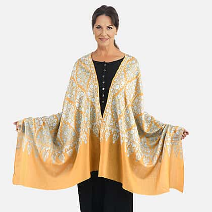 100% Merino Wool Silk Shawl with Hand Embroidered in Kashmir - Free 6ml Concentrated Jasmine Oil - Mustard