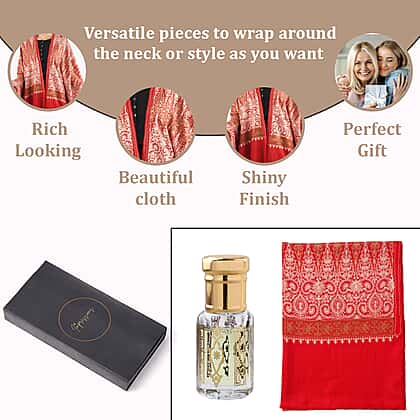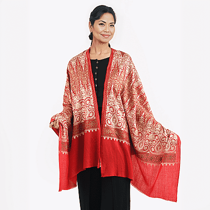 100% Merino Wool Silk Shawl with Hand Embroidered in Kashmir - Free 6ml Concentrated Rose Oil - Red