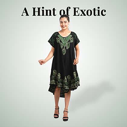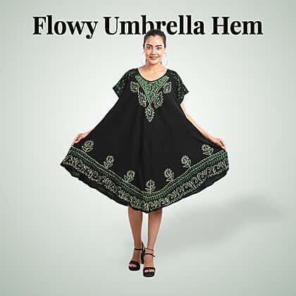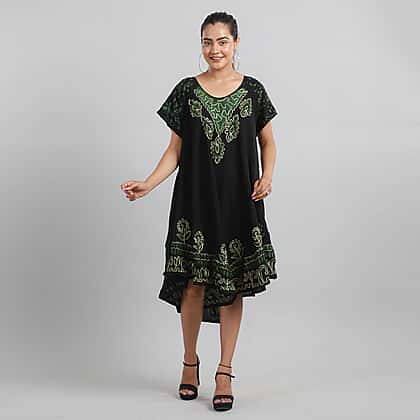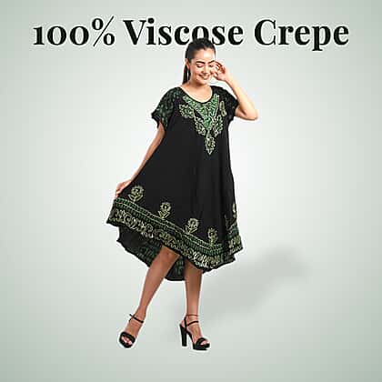 100% Viscose Crepe Umbrella Dress Embellished with Batik and Embroidery (Size 120x105 Cm) - Black & Green