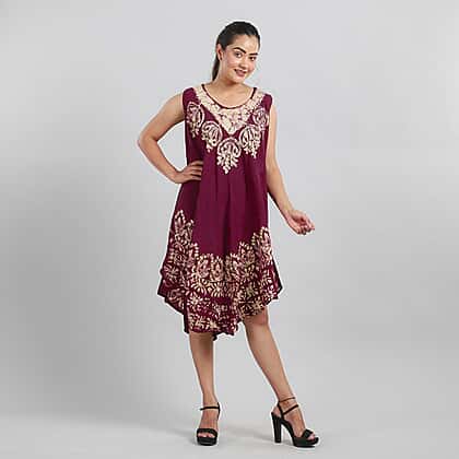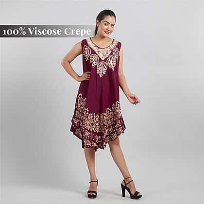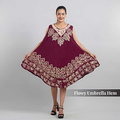 100% Viscose Crepe Umbrella Dress Embellished with Batik and Embroidery (Size 120x105 Cm) - Burgundy & Beige