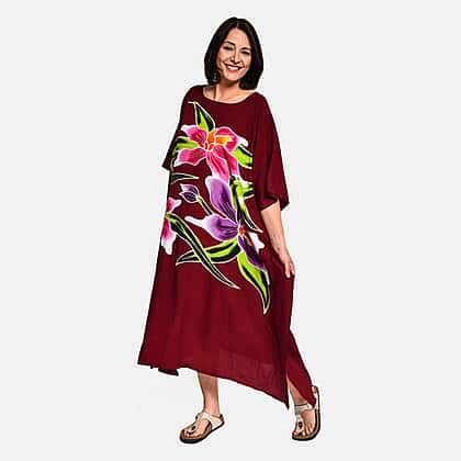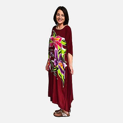 100% Viscose Handpainted Floral Pattern Kaftan Dress (One Size) - Burgundy & Multi