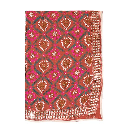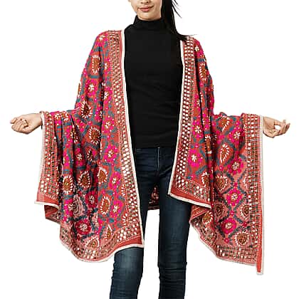 This winter, stays warm and stylish with this embroidered long scarf which gives a unique touch to your outfit. This scarf is made from 100% viscose fabric, making it durable and lightweight. It features Indian Phulkari embroidered detailing all over it in a floral design and has mirror work detailing on the boundary to give it a bright shine and sparkle. You can pair it with your maxi dress or kaftan outfit to elevate the look.
