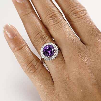 Certified and Appraised LUXURIANT 10K White Gold AAA Lab Grown Purple Sapphire, Lab Grown Diamond EF, VS Halo Ring 4.48 Ct.