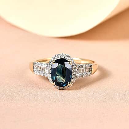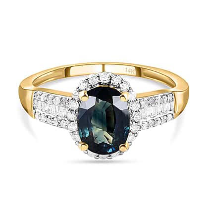 14K Yellow Gold AAA Ocean Teal Sapphire (OVL 1.60 cts) and Diamond Ring 1.91 Ct.