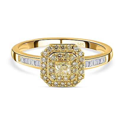 This precious yellow and white diamond ring makes your outfit extra shine and sparkle. This double halo ring in a pentagon frame is decorated with diamonds secured in a prong setting, exhibiting bright sparkle and shine. It is made of 14K yellow gold with a sleek shank and smooth under gallery offering a comfortable fit. You can wear this ring on your big day and spread the glamour.