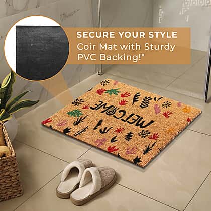 15mm WELCOME with Flower - Leaf Design PVC Backed Coir Natural Printed Rug and Door Mat (Size 60x40 cm) - Brown - Multi