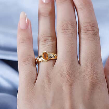 Delight yourself with the exotic beauty of the Fire Opal and Moissanite Ring that looks breathtaking in the dual finish of Rhodium Overlay and 18K Vermeil Yellow Gold over Sterling Silver. An oval-shaped opal impresses with its fiery orange hues radiating from a bezel setting. The white moissanite decoration along the shank creates a contrasting fire and ice portrait.
