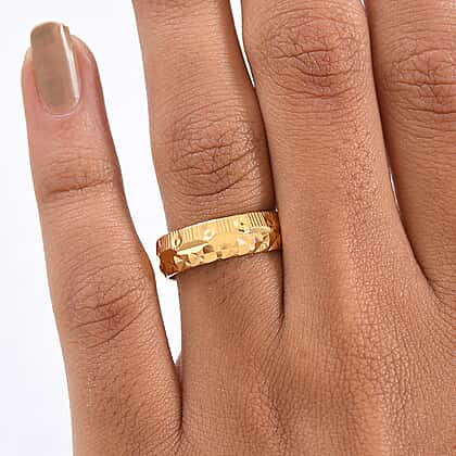 Showcasing a striking yellow gold band ring, a perfect fusion of shine and refined beauty. The carved pattern adds texture, catching the light beautifully from every angle. Crafted in pure 925 sterling silver with 18K yellow gold plating, this ring offers durability and warm tone shine. Its hypoallergenic nature provides comfort and safety to sensitive skin. Smooth on the inner band for easy, daily wear, it’s a style that pairs well with casual looks as well as dressier outfits. With its bold presence and polished finish, this ring offers a standout addition to any jewellery collection.