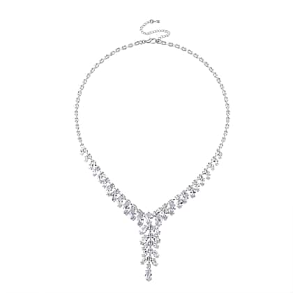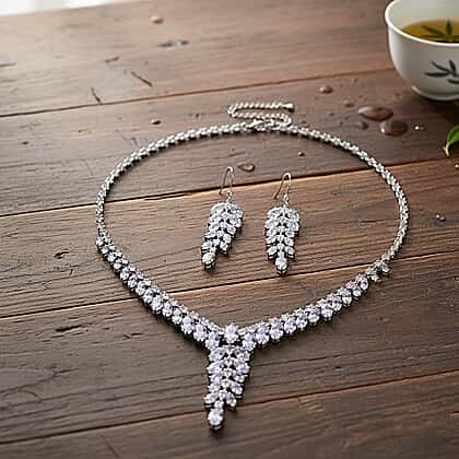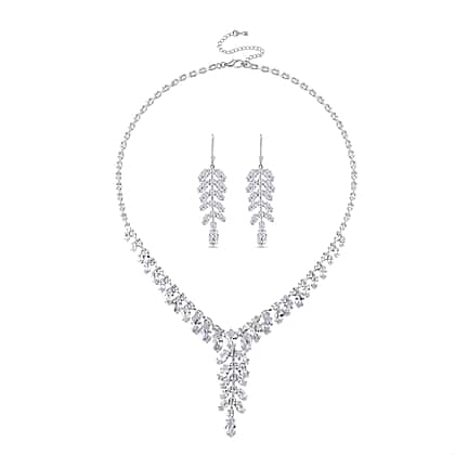 Add dazzling touch to your look with an Austrian white crystal jewellery set. Crafted in pure white brass, it features delicate crystals that reflect light beautifully. This sparkling necklace can an air of sophistication and luxury to any outfit. The necklace's intricate design gently curves around the neckline, with a cascading drop of crystals that adds a touch of glamour. The earrings mirror the necklace’s design with their graceful and sparkling droplets. Perfect for special occasions or to elevate your everyday look with a touch of elegance.