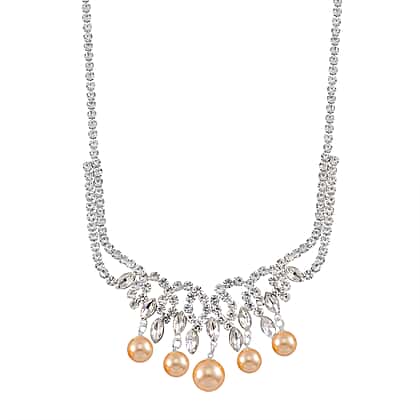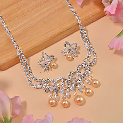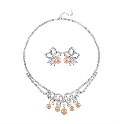Revel in the sweet touch of golden glamour with this stunning set featuring golden shell pearls and white crystals in a breathtaking contrast. The necklace and earrings are crafted from pure white brass, bringing a touch of fine radiance and durability. The golden shell pearls are big sized and draw attention to your neckline.