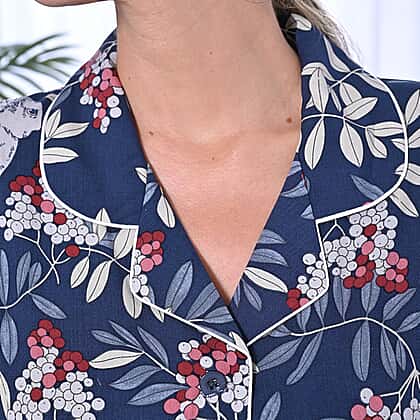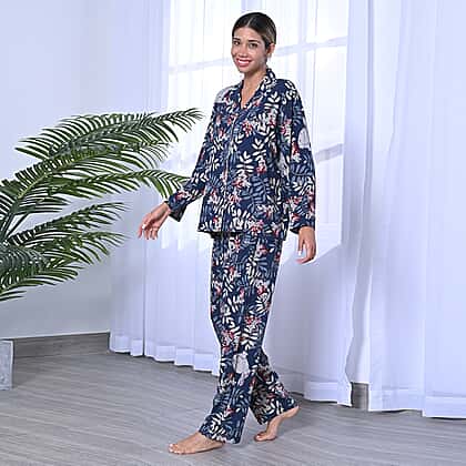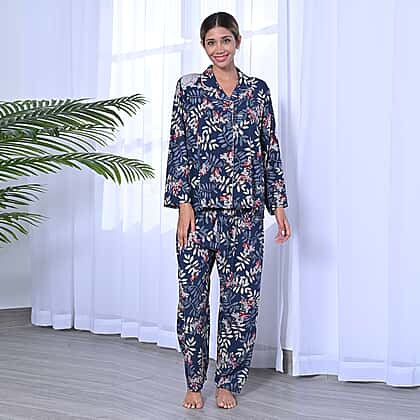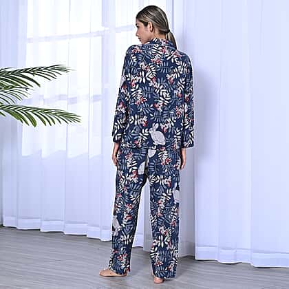 2 Piece Set - LA MAREY Viscose Floral Pattern Sleepwear Includes Long Top and Pants - Navy