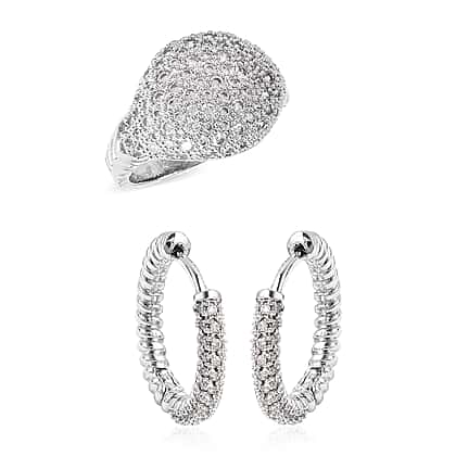 2 Piece Set - Simulated Diamond Dome Ring and Hoop Earrings in Silver Tone