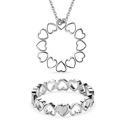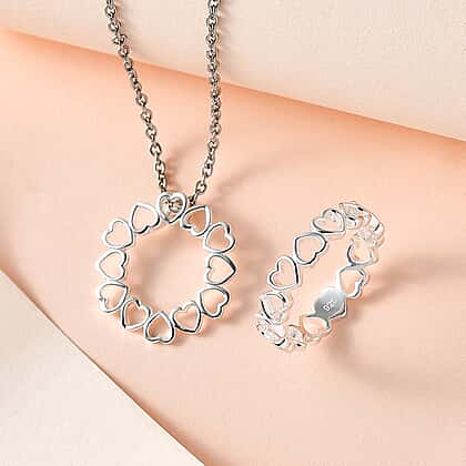 2 Piece Set - Sterling Silver Heart Ring and Pendant with Stainless Steel Chain (Size 20)