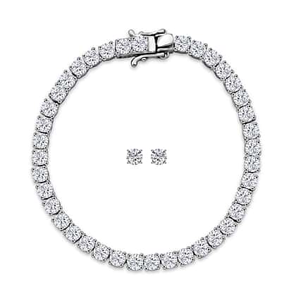 2 Piece Set Moissanite Stud Earrings and Tennis Bracelet (Size 7.5) GB Lock Box in Rhodium Overlay Sterling Silver 11.00 Ct.