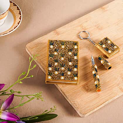 With the festive season around the corner, this set of three items makes a great gifting option. The set contains a diary, a keychain attached with a journal and a ballpoint pen. Each item is handcrafted and useful in day-to-day chores. The unisex design makes this set a versatile gifting option for both men and women. All three items are decorated with beads by artisans who craft fine jewellery.