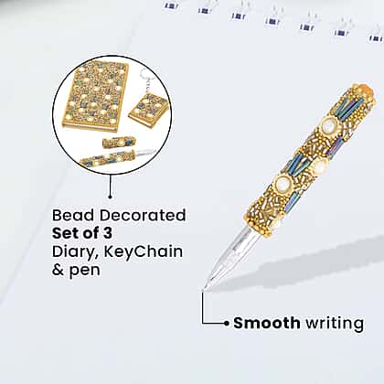 3 Piece Set - Fuchsia Frolic Bead Decorated Diary (Size 12 Cm), Key Chain (Size 4x5 Cm) and Pen- Golden